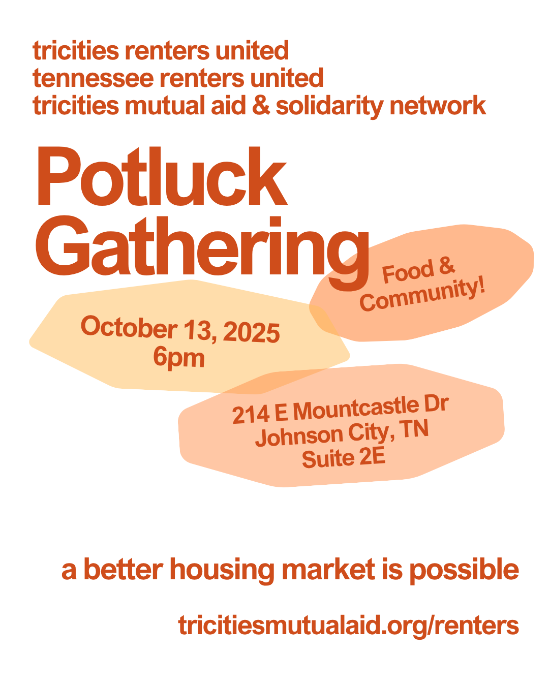 We'll have a little social gathering on Monday, October 13th for community, food, and renter rights discussions! It'll be at 214 E Mountcastle Dr Suite 2E in Johnson City, TN at 6pm. Bring food, bring your friends, tell your neighbors!